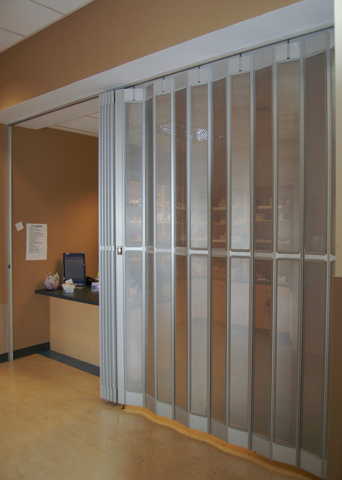 • Intermediate posts shall be provided for every 10’ maximum (countertop mounted, 6’ maximum) of curtain length and at each curve. Intermediate posts shall contain an adjustable concealed spring-loaded drop bolt with cylinder locks keyed alike. Dustproof floor sockets shall be provided for all drop bolts.